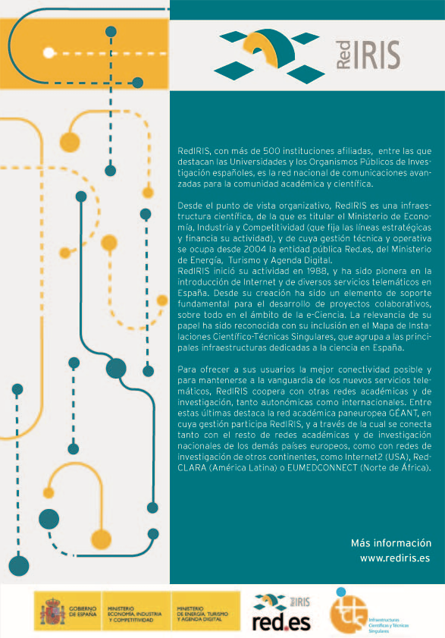 Para tener un conocimiento más amplio sobre los servicios, proyectos y actividades que realiza RedIRIS, tenéis a vuestra disposición el folleto corporativo de RedIRIS. Un documento que incluye información sobre qué es RedIRIS y sus principales líneas de actuación.