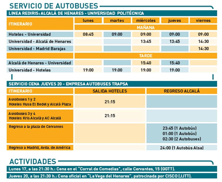 RedIRIS pone a disposición de los asistentes un servicio gratuito de autobuses. Aparte de los plenarios y las sesiones, se han organizado dos eventos sociales. Podéis consultar la información: