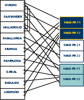 Estos nueve accesos FR, se concentran en el nodo de Madrid en seis accesos FR de 2 Mbps de acuerdo con el esquema de conexión de PVCs representado en la figura 2. Estos seis accesos se reparten entre tres centrales de Telefónica distintas para una mayor tolerancia a fallos (los 2 PVCs con cada nodo van por dos centrales distintas).
