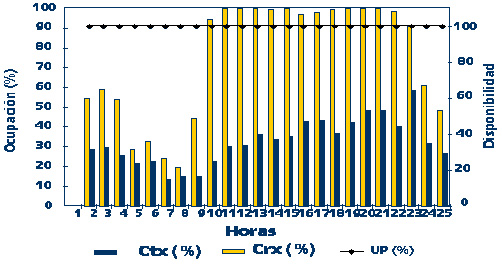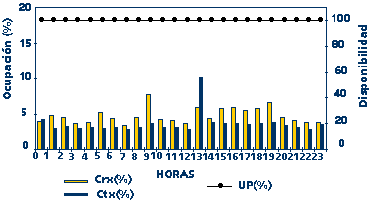 A continuación, podemos observar la ocupación horaria de la línea internacional con EuropaNet del pasado día 01/03/96. La ocupación del enlace se encuentra al 100% en recepción a partir de las 9 de la mañana y esta saturación se mantiene hasta las 11 de la noche.