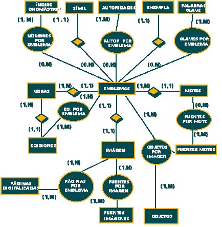 Cabe destacar aquí la existencia de gran cantidad de entidades que hacen el papel de Thesaurus (onomásticas, símiles, autoridades, palabras clave, exempla, fuentes de las imágenes, imágenes secundarias, fuentes de los motes, ...), y que serán de gran utilidad para hacer búsquedas en los miles de tuplas que almacenarán algunas de las tablas, especialmente en la de Emblemas.