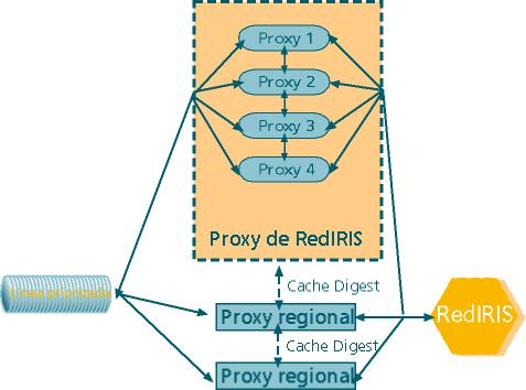 A la puesta en funcionamiento de la línea priorizada, hay que añadir la relación de hermandad entre la mayoría de los proxys regionales, la cual se realiza mediante Cache-Digest. Este sistema les permite compartir entre sí la información que tienen almacenada, mediante una serie de tablas índice que se intercambian los servidores cada cierto tiempo. Con ello se consigue un mayor ratio de "hits" (peticiones que son servidas por los proxys sin necesidad de obtenerlas del servidor origen), y por tanto, un aumento en el rendimiento del servicio.
