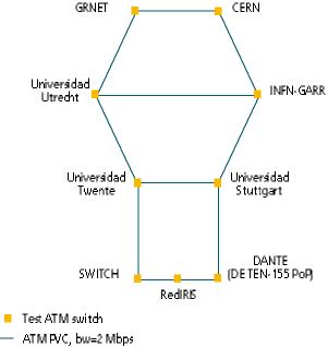 La red parcialmente mallada, interconecta a nueve participantes y está basada en circuitos virtuales ATM CBR de 2 Mbps.