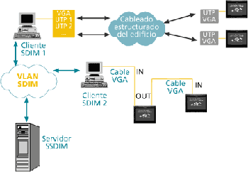Conversores de señal VGA-UTP-VGA: aprovechar el cableado estructurado del que se dispone en los edificios, para transmitir la señal a través del cable UTP. Para ello, debería conectarse a la interfaz de salida de señal VGA del cliente, un conversor de señal VGA-UTP, o de VGA a un grupo de interfaces UTP (para multiplicar la señal a n monitores). Así, una vez convertida la señal, ésta puede transmitirse a través del cableado UTP del edificio hasta el extremo del monitor (o n monitores). En este punto, se instalaría un conversor de señal UTP-VGA, y se conectaría éste a la interfaz de entrada del monitor, visualizándose así la señal.