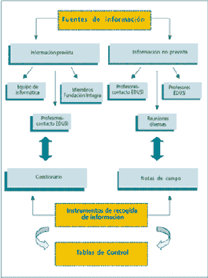En la Figura 1 podemos ver el proceso que se ha llevado a cabo para la recogida de información procedente de profesores y alumnos. Se cuenta con unas determinadas fuentes de información que interaccionan con los instrumentos de recogida y, por último, la información recogida a través de éstos instrumentos se vuelca en una serie de tablas de control para su posterior análisis. Veamos algunos de los resultados obtenidos.