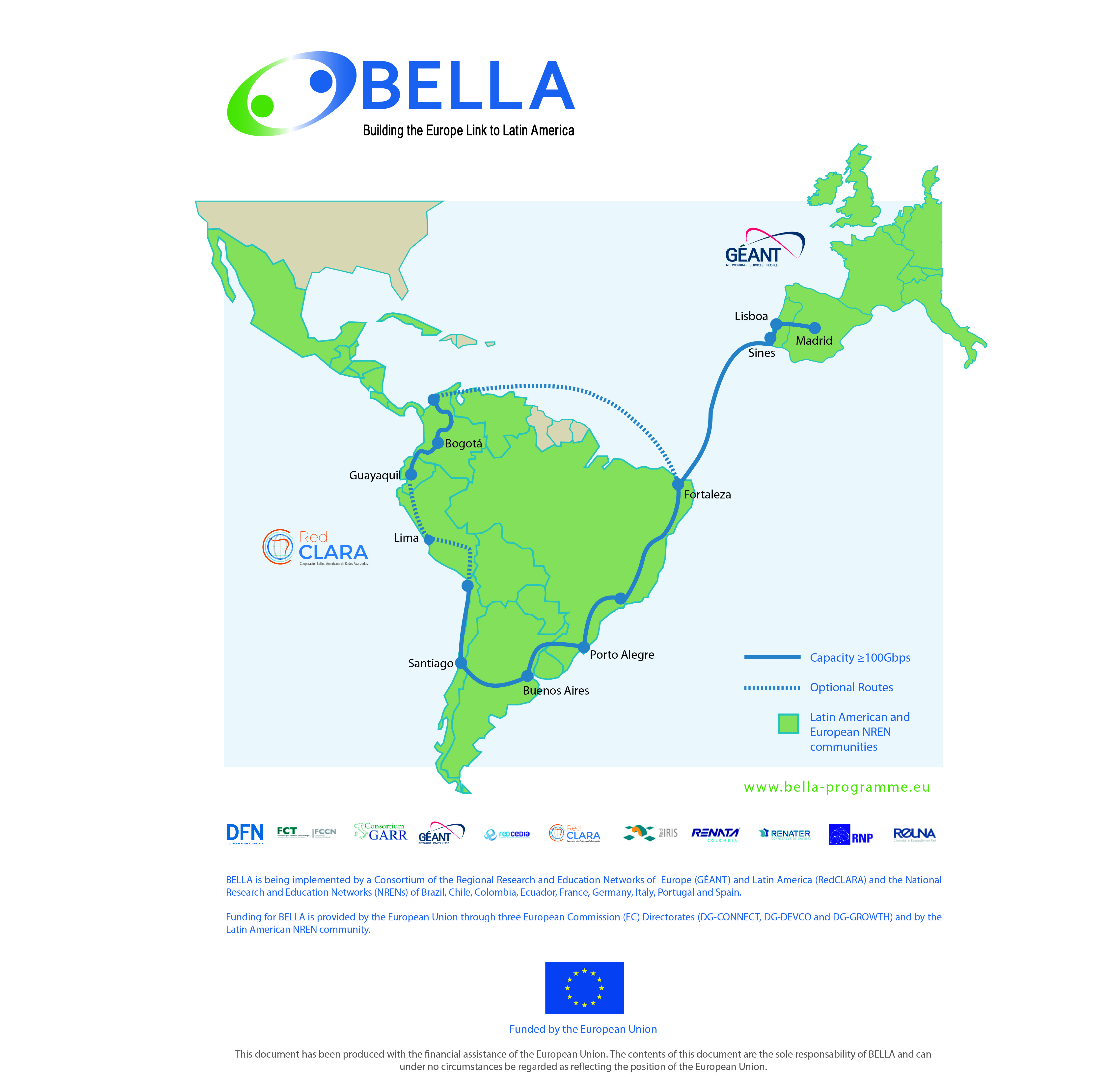 BELLA es implementado por un Consorcio de Redes Regionales de Investigación y Educación integrado por GÉANT (Europa) y RedCLARA (América Latina), y por las Redes Nacionales de Investigación y Educación (RNIEs) de Brasil, Chile, Colombia, Ecuador, Francia, Alemania, Italia, Portugal y España. La financiación de BELLA corre a cargo de la Comisión Europea (DG-CONNECT, DG-DEVCO y DG-GROWTH) y de las RNIEs de América Latina.