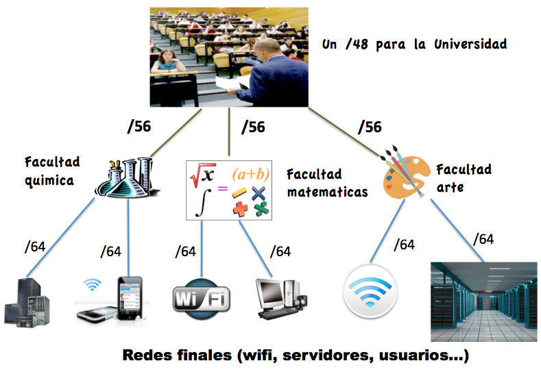 En cada facultad, los /64 para las diferentes redes, del anterior prefijo..