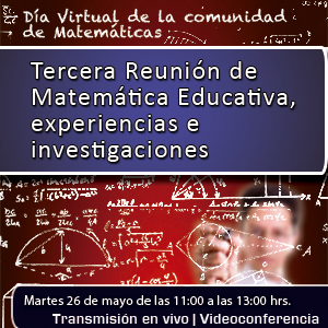 El Dr. René Luna, coordinador de la comunidad de matemáticas en CUDI, y la Dra. Verónica Vargas de la Universidad de Quintana Roo, convocan a educadores, investigadores, especialistas y estudiantes en Matemática Educativa a la Tercera Reunión de Matemática Educativa,"Experiencias e Investigaciones", a realizarse el día martes 26 de mayo de las 11:00 a las 13:00. El objetivo de este encuentro es compartir avances o resultados de investigaciones y experiencias en Matemática Educativa en todos los niveles educativos. Más información