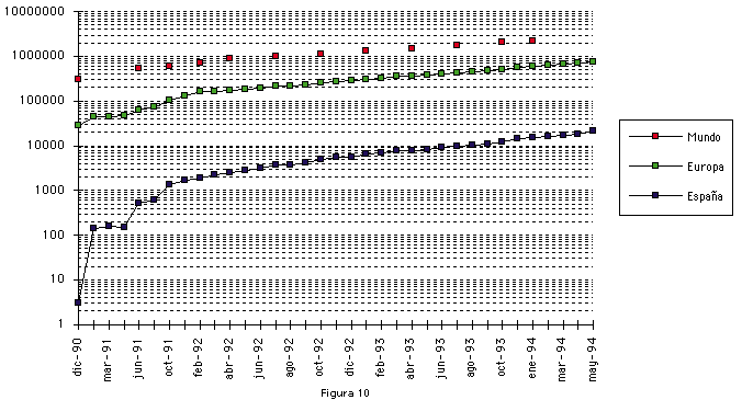 En el gráfico de la figura 10 se muestra el crecimiento del número de ordenadores conectados a Internet en España en comparación con los conectados en toda Europa y en todo el mundo. Últimamente, las tasas de crecimiento en España son incluso superiores a las de la media europea y mundial, con incrementos de hasta un 15% mensual.