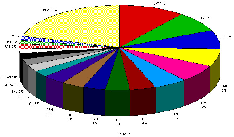 .En cuanto al número de organizaciones españolas con conectividad total a Internet, la gráfica de la figura 11 muestra la evolución experimentada. Un dato interesante es el de la distribución de ordenadores conectados a Internet por organización (figura 12), pues da idea del grado de penetración o uso dentro de cada una.