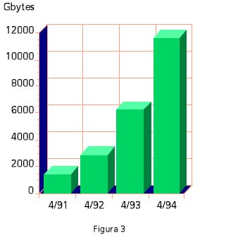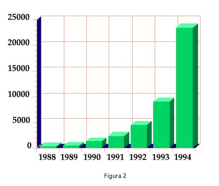 Desde finales de los 80 la Internet ha venido experimentando un crecimiento exponencial en casi todos sus parámetros, como se aprecia en las figuras adjuntas (1, 2 y 3) donde se muestran, respectivamente, los crecimientos en número de ordenadores conectados, número de redes conectadas y tráfico mensual que pasa por NSFnet (sólo una fracción del intercambiado por toda la Internet). Estos crecimientos tan enormes no tienen precedentes en la historia de las comunicaciones, ni siquiera en la red telefónica.
