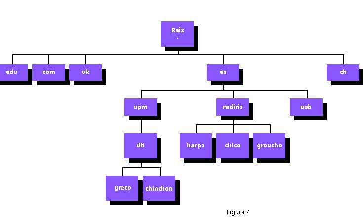 Básicamente el DNS consiste en una base de datos distribuida de forma jerárquica por toda la Internet que es consultada por las aplicaciones de usuario para llevar a cabo la traducción entre los nombres y las direcciones numéricas. La distribución jerárquica (ver figura 7) permite crear distintos niveles o dominios de responsabilidad para garantizar la univocidad de los nombres (lógicamente no puede haber dos ordenadores en Internet con el mismo nombre): en el nivel superior se encuentran los dominios asociados a los distintos países ("uk": Reino Unido, "ch": Suiza, "es": España, etc.) aparte de algunos especiales ("edu", "com", "net", etc.); por debajo de éstos se suelen encontrar los dominios correspondientes a las distintas organizaciones conectadas a Internet dentro de cada país (por ejemplo, dentro de España, "upm": Universidad Politécnica de Madrid, "uab": Universidad Autónoma de Barcelona, etc.), que a su vez pueden estar estructuradas en departamentos a uno de los cuales pertenece el ordenador nombrado. El nombre en Internet de una máquina se construye yuxtaponiendo los nombres de los distintos niveles separados por puntos, por ejemplo: greco.dit.upm.es. El administrador de cada nivel, que mantiene su parte correspondiente de la base de datos distribuida del DNS, es responsable del registro de los nombres de dominio dentro de su nivel, garantizando que sean únicos a ese nivel.