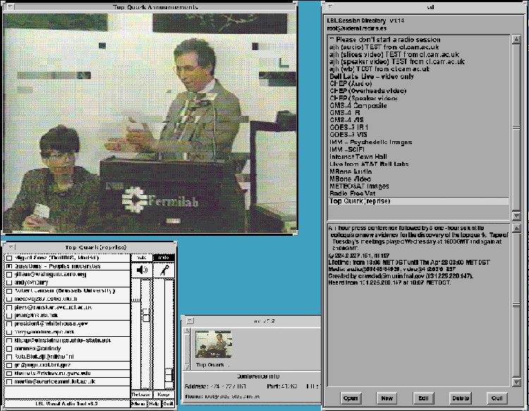 Gracias a la red virtual MBONE (red por encima de Internet cuya estructura y alcance se representa en la figura 8), en la actualidad ya se retransmiten en directo por Internet acontecimientos tales como conferencias y reuniones internacionales de todo tipo, misiones científicas (como las últimas expediciones del transbordador espacial de la NASA), operaciones médicas, cursos de teleenseñanza, etc. Desde cualquier ordenador conectado a MBONE un usuario puede "sintonizar" la retransmisión que más le interese o incluso participar en ellas. Como ejemplo, la figura 9 muestra un momento de la audio-videoconferencia emitida recientemente desde Fermilab con ocasión del descubrimiento del "TOP Quark" vista y oída desde un ordenador en las oficinas de RedIRIS en Madrid. El principal factor que puede limitar una mayor extensión de este tipo de aplicaciones son los elevados anchos de banda requeridos.