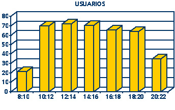 - Estadísticas de uso del acceso a bibliotecas: la informatización de las bibliotecas de la UPC ha permitido hacer accesible desde cualquier estación de trabajo conectada a la red, el fondo bibliográfico de la UPC constituido por 216.500 libros y 13.000 revistas, tanto para consulta como para la reserva de ejemplares. Durante el primer semestre de 1995, este servicio ha tenido la actividad siguiente según franjas horarias: