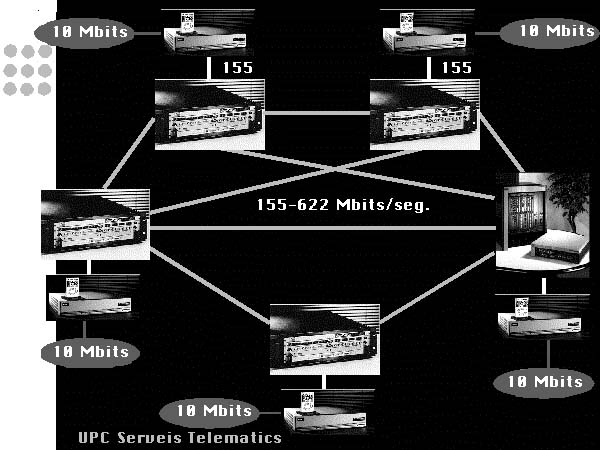 En paralelo a la política informática, se ha llevado a cabo el desarrollo de la red informática de la UPC que, iniciada en 1981-82 con la instalación del primer segmento troncal de Ethernet, ha permitido la conexión de todos los equipos anteriores y la posterior integración de servicios.Durante todo este tiempo el crecimiento de la red ha sido vertiginoso, capilarizando todos los rincones de la Universidad y llegando a conectar algo más de 200 segmentos Ethernet. Sin embargo, este fuerte crecimiento ha puesto de manifiesto los inconvenientes inherentes a la tecnología Ethernet y en particular los relacionados con la falta de estructura, la limitación de velocidad, la continuidad eléctrica de la red y por tanto la facilidad de propagación de averías, la dificultad de implementar servicios multimedia y la imposibilidad de utilizar servicios que requieran tiempo real.