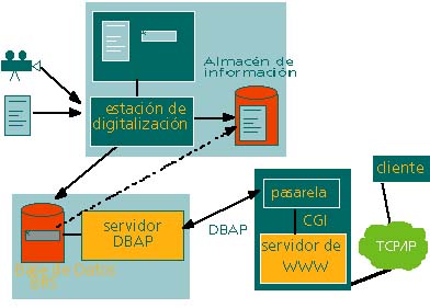 El sistema digital de archivo y recuperación de información se compone de tres bloques: el servidor DBAP, el almacén de información digital, y el cliente DBAP, que en una primera fase se implementará mediante una pasarela en el servidor de Web (ver figura).
