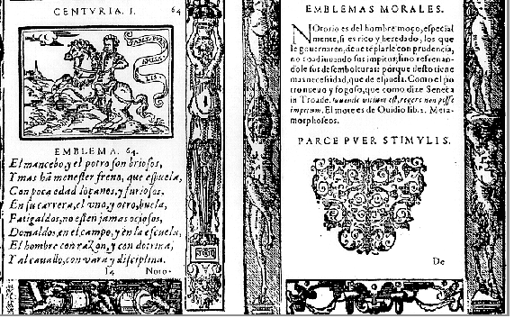 El maridaje entre imagen y palabra tiene larga historia en la cultura de la humanidad, pero encontró unas condiciones para fraguar de forma epistemológica e impregnó grandes ámbitos de la cultura y el pensamiento europeos entre mediados del siglo XV y los comienzos del XVIII en forma de un género que nació de manera casual: nos referimos al emblema, con las modalidades de empresa, jeroglífico, divisa..., que por lo general se nutren de los mismos elementos: cuerpo y alma (imagen y palabra) aunque sean destinados a receptores diferentes, lo que determina sus variaciones. El emblema surgió cuando Andrea Alciato, jurisconsulto italiano, practicando un ejercicio propio de humanistas (traducción, imitación) compuso, inspirándose en la Antología griega, 99 epigramas latinos, a cada uno de los cuales puso un título. Dedicó la obra al duque Maximiliano Sforza y la fortuna quiso que, a través del consejero imperial Peutinger, la obra llegara a manos del impresor Steyner quien, con visión comercial, consideró lo apropiado que sería añadir una ilustración a cada epigrama. La tarea se encomendó al grabador Breuil y el libro salió publicado en 1531 en Augsburg con el título de Emblematum liber. La obra tuvo un enorme éxito (ha alcanzado más de 175 ediciones) y pronto fue imitada por otros, así como comentada. Esta recepción se explica porque el librito recogía sabiamente algo que estaba entre las aspiraciones de algunos círculos de la Europa del momento: la creación de un lenguaje universal, a base de imágenes, a imitación de los jeroglíficos egipcios, pero explicadas con textos, bajo la pretensión de transmitir reglas de conducta de utilidad para el género humano.