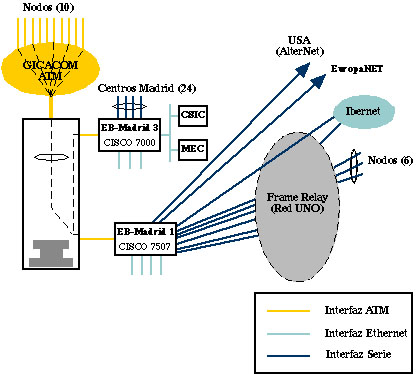 En la actualidad tenemos contratados con Telefónica un total de 11 PVCs que se concentran en el nodo de Madrid en un conmutador ATM (Fore ASX-200). Este conmutador está unido al router EB-Madrid1.red.rediris.es que es el que soporta los enlaces troncales con las restantes comunidades autónomas con accesos Frame Relay, y los accesos externos a RedIRIS (EuropaNet, USA e Ibernet).