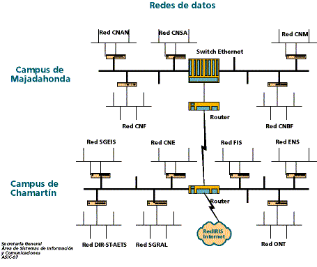 En la imagen anterior puede apreciarse la estructura de la red de datos del Instituto. Está basada en tecnología Ethernet y el acceso a Internet es proporcionado por RedIRIS. El protocolo empleado es TCP/IP y en la red conviven servicios basados en entornos UNIX y Windows NT. Se cuenta con 6 clases C y la comunicación entre los diferentes dominios NT es gestionada por el servicio WINS.