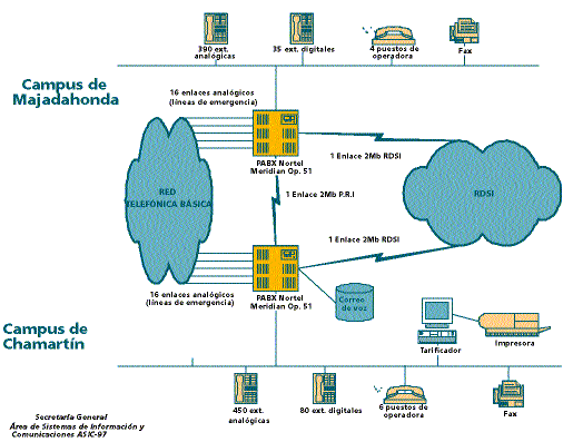 El esquema siguiente refleja la infraestructura empleada para proporcionar servicios de voz en los dos campus: -dos centralitas gemelas Nortel Meridian 51 conectadas en red privada y proporcionando servicios de tarificación y correo de voz a unos 1000 terminales analógicos y digitales y equipos de fax.