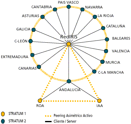 Su principal finalidad ha sido la puesta en marcha de un servicio de tiempo en la comunidad RedIRIS, basado en el protocolo "Network Time Protocol" de Internet. En su desarrollo se ha contado con la ayuda especial del Real Instituto Observatorio de la Armada que dispone de la hora oficial en España.Los servidores de hora se dividen de una forma jerárquica en diferentes niveles "stratum" en función de la lejanía de una fuente con la hora de referencia. Los "stratum 1", puntos en amarillo en la figura 3, representan equipos que se sincronizan directamente de un reloj nuclear o un sistema GPS. Estos sistemas se encuentran instalados en RedIRIS, en el Real Instituto Observatorio de la Armada (ROA), y en el Instituto Astrofísico de Andalucía (IAA). Los "stratum 2", puntos azules, son equipos que se sincronizan a partir de un "stratum 1", y se encuentran en los nodos (routers) de la red. Las líneas en negro representan las relaciones cliente/servidor del servicio de hora.
