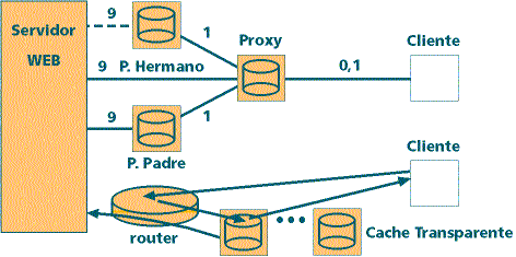 Los servidores proxy caché pueden relacionarse entre sí de dos formas: en una relación de hermandad, solicitando la información que uno no posee al otro servidor hermano (este, si no tiene el documento,no lo actualiza en su caché), y en una relación jerárquica de padre a hijo, en la cual el servidor proxy padre actualiza su caché y resuelve las comunicaciones al hijo, tal como se muestra en la figura 4.