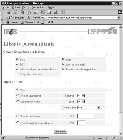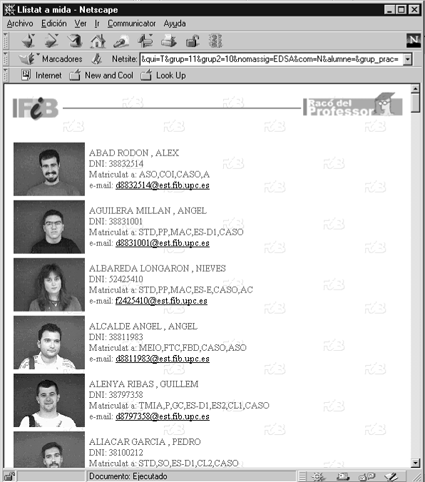 Desde el curso 96-97 durante el proceso de matrícula se obtiene la imagen digitalizada de todos los estudiantes. Esta información, junto con la obtenida de la base de datos de gestión académica, permite elaborar los listados y fichas de clase.Desde la aplicación de listados, se puede consultar (e imprimir) en diferentes formatos la información relevante que la facultad pone a disposición de los profesores sobre los estudiantes matriculados de su asignatura. El profesor puede seleccionar los campos que desea que aparezcan en el listado y el tipo de ordenación o puede extraer listados de formatos ya predeterminados.