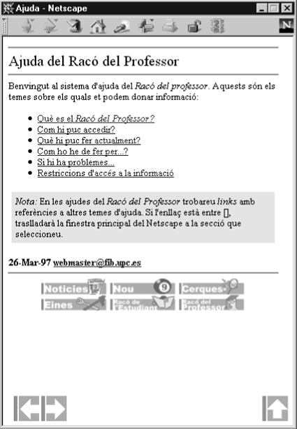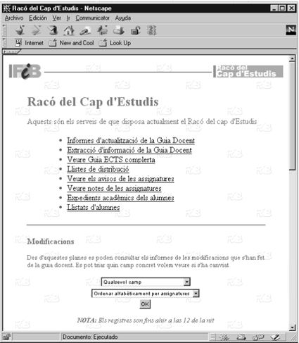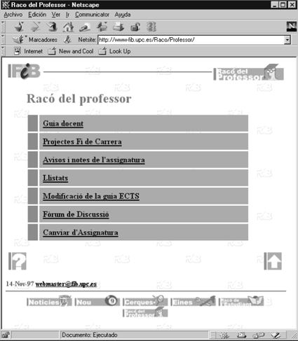 Ante la gran aceptación del servicio de información, se decidió aumentar los servicios ofrecidos a través del WEB por medio de aplicaciones más específicas destinadas a los principales colectivos de la Facultad: estudiantes (el "Racó de l'Estudiant") y profesores (el "Racó del Professor"). El tratamiento por perfiles evita la dispersión de información ocasionada por el gran volumen de información disponible y permite ofrecer servicios concretos en función de las distintas necesidades de estos colectivos. Estos servicios actúan como herramientas de gestión académica (pues además de simplificar el acceso a la información académica, permiten capturar información relevante como la Guía Docente) y como herramientas de soporte a la docencia, facilitando la comunicación entre los profesores y estudiantes.Todas las herramientas presentadas en este documento pueden utilizarse desde cualquier lugar de Internet (lo que permite a nuestros usuarios trabajar y consultar información desde su casa), pues están basadas en tecnología de WWW, CGIs y JAVA.