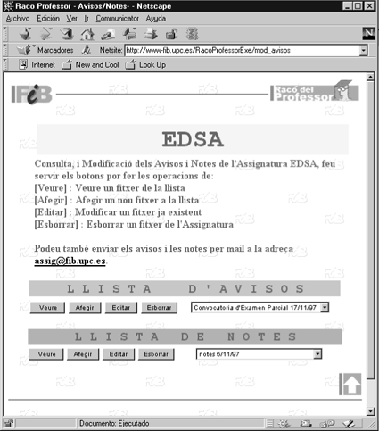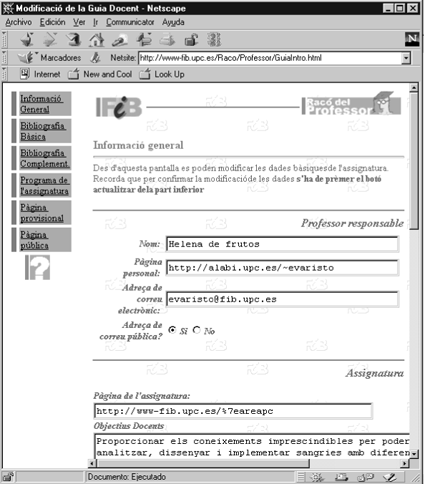 Una de las funciones del profesor responsable es la de mantener actualizada la información de su asignatura en la Guía Docente. Esta actualización se realizaba tradicionalmente reportando las modificaciones de forma impresa al centro. A partir de estos papeles, surgía la versión impresa y la electrónica.Para agilizar este proceso, se desarrolló una aplicación que permitiese al profesor realizar estas actualizaciones directamente sobre un soporte electrónico, utilizando tecnología WWW. Esta aplicación empezó a utilizarse en Junio de 1996 para elaborar la Guía Docente del curso 96/97 y ha permitido reducir considerablemente la tarea administrativa necesaria para generar la Guía.