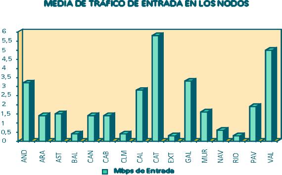 En lo que se refiere a los enlaces con las distintas comunidades, se han estudiado medidas de tráfico (valores máximos) en días laborables, observándose un aumento generalizado del tráfico debido al aumento del ancho de banda de la línea con Estados Unidos, y siendo más acusado en las Comunidades de Cataluña y Valencia.