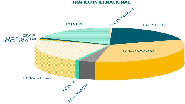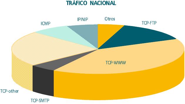 Con datos tomados durante quince días se observa que el protocolo más utilizado es el HTTP, seguido del FTP y de tráfico originado en aplicaciones varias sobre TCP.