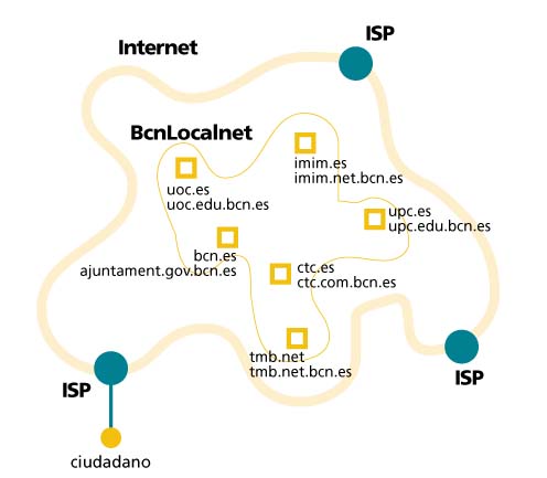 • Desde ese momento cualquier servicio o aplicación de empresas, instituciones o particulares de la ciudad podría incluirse en Localnet sólo con que diesen a su servidor un nombre bajo el subdominio de la ciudad (además del que ya tengan de cara a la Internet global), p.e. www.upc.edu.bcn.es, www.ub.edu.bcn.es, www.enredando.com.bcn.es, etc.