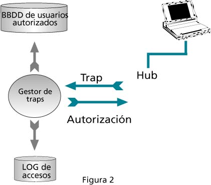Para evitar los inconvenientes manteniendo las funcionalidades, decidimos utilizar una política de traps. Activamos el uso de traps en nuestros activos, de forma que cuando se produce un intento de conectar una máquina en un punto con este nivel de securización, el concentrador lo notifica mediante un trap indicando la dirección MAC que intenta conectarse. Un script corre en background en una máquina que realiza las funciones de gestora de traps. Al detectar un trap, si se trata de una máquina autorizada, se le permite el acceso inmediato. Para que un usuario esté autorizado, la primera vez que usa el servicio debe darse de alta. De esta forma, reducimos a uno el número de accesos al servicio de directorio LDAP. Gráficamente, el sistema funciona como se muestra en la figura 2 donde, para simplificar, no se incluye el primer acceso LDAP que simplemente actualiza la base de datos de puntos permitidos por medio de la cgi.