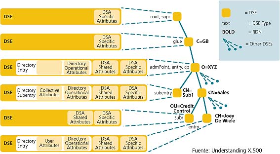 - Directory Information Base (DIB): es un conjunto de información sobre objetos de interés (usuarios, aplicaciones, etc.)