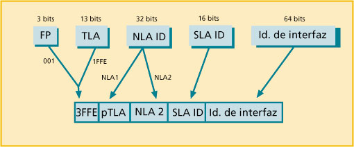 Desde el punto de vista del encaminamiento, destacaremos que las direcciones 6bone siguen el formato agregable global. El campo TLA (Top Level Agreggation) es utilizado como identificador de 6bone. Dicho campo toma el valor 0x1FFE, valor asignado por la IANA. Lo que se persigue con el formato agregable global es una mejor agregación de las rutas, de manera que el tamaño de las tablas de encaminamiento en los routers del backbone sea mínimo. Así en el caso de 6bone, se establece una jerarquía de 3 niveles: en el primer nivel se encuentran los pTLAs que conforman el backbone (RedIRIS, Surfnet,..), que desempeñan el papel de ISPs experimentales y son los encargados de distribuir rangos de direcciones. El segundo nivel está formado por nodos de tránsito, que se conectan a uno o a varios nodos del backbone, y que a su vez proporcionan servicio de tránsito al último nivel de la jerarquía: los nodos hoja.