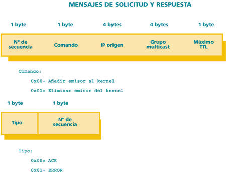Para la comunicación entre estas dos entidades se emplea un protoloco del tipo call/response que hemos denominado mcontrol. El musersd será el servidor que quedará permanentemente escuchando a los comandos que le llegan por determinado puerto UDP.El formato de los mensajes aparece en la siguiente figura.