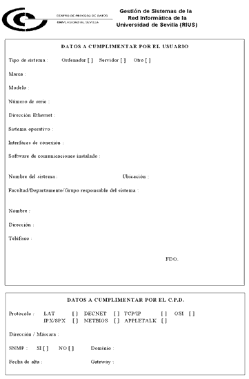 En un principio el usuario que quería conectarse a la red, solicitaba al CPD una dirección IP y para ello rellenaba un formulario, en el que indicaba los datos más esenciales de la maquina (tipo, modelo, número de serie, dirección ethernet, etc.) y los suyos propios (nombre, teléfono, etc.). Estos datos se completaban con otros añadidos por los responsables del servicio (dirección IP, máscara de red, gateway, etc.) y el conjunto constituía el documento formal de control que permitía la conexión. Sin embargo, era el propio usuario el que explícitamente tenía que solicitar que se diera de alta la máquina en el DNS, aunque posteriormente en cualquier momento podía solicitarlo.