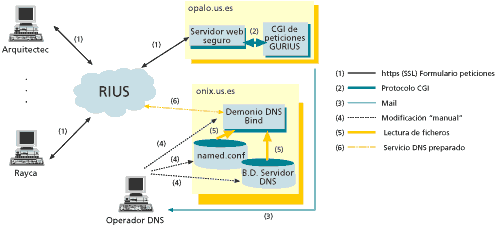 Una vez recibida la petición, esta debía ser procesada manualmente. Se tenían que comprobar los datos de la petición y modificar la Base de Datos del Servidor DNS con toda la problemática que esto lleva consigo: realización de una copia de seguridad, actualización "a mano" de los ficheros de la Base de Datos, re-inicializar el servidor de DNS para que los cambios tuvieran efecto, comprobar el correcto funcionamiento, archivar la petición y comunicar que la petición se había realizado.