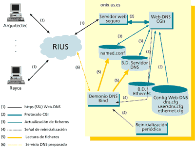 De éstas necesidades surge la aplicación Web-DNS. Ésta consta de una serie de páginas Web con formularios de entrada de datos, páginas Web de salida de resultados, programas CGI y tres ficheros de configuración. La aplicación es muy modular: hay un proceso CGI para cada acción típica (un CGI para dar de alta, un CGI para realizar consultas por dirección IP, etc.) por lo que resultaría muy fácil ampliarla con nuevas funciones.