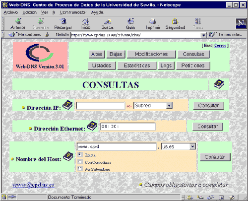 - Consultas : Con éste formulario se realizan consultas por dirección IP, dirección Ethernet y varios tipos de consulta por nombre (de Host o de Alias).