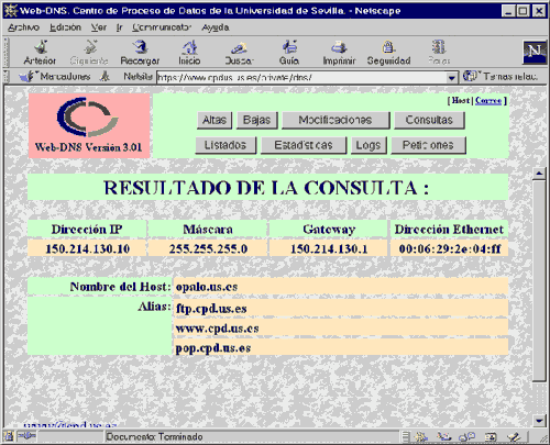 Que un operador desde un centro periférico rellene un formulario en una página Web con los datos de un alta de una dirección IP y vea que ésta se produce al instante y sin tener que esperar varios días o poder realizar consultas complejas por nombre, realizar listados, o analizar las estadísticas de ocupación de las subredes o de aquellos Host que actúan como intercambiadores de correo, ha sido un gran avance. Web-DNS ha supuesto una descarga de trabajo en las personas encargadas del mantenimiento del Servidor de Nombres de la Universidad de Sevilla sin que se haya perdido el control y la seguridad sobre el mismo.