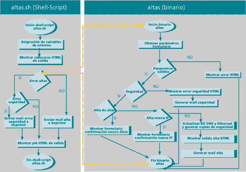 Los binarios se encargan del resto: reciben los parámetros del formulario y los comprueban. Si son correctos, se realiza una copia de seguridad de los ficheros afectados, se actualizan los Serial de los ficheros a modificar y se realiza la modificación en la Base de Datos. Una vez realizado esto, se genera el núcleo del documento HTML que se le enviara al usuario y el contenido del correo. El correo con los datos de la petición se envía tanto a la persona que la produjo como a los miembros del Grupo de comunicaciones del CPD. Si los datos son incorrectos, generan el núcleo de la página HTML con el mensaje de error.