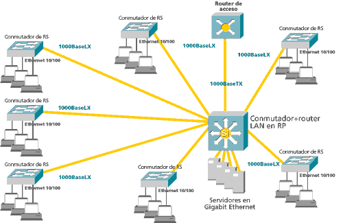 - En el RP un conmutador de nivel 3 (router+conmutador de tramas LAN integrados en el mismo bus) a velocidad de cable que conecta las diferentes redes virtuales LAN (sobre las que se superponen redes IP de máscara variable). A este conmutador se conectan los conmutadores de nivel 2 de los RSs y todos los servidores en la granja de servidores.