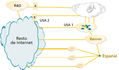 Aunque a lo largo del año los tráficos externos se han ido incrementando constantemente es a finales cuando se produce el mayor crecimiento debido a los cambios experimentados en los diferentes caudales. La conexión a los proveedores comerciales mediante Ibernet-Espanix se mantiene en 34 Mbps durante gran parte del año por lo que ya después de agosto la saturación es considerable y sólo se soluciona cuando el 27 de noviembre se aumenta el caudal hasta 64 Mbps. No obstante, los 64 Mbps se saturan en las horas punta y se tratará de aumentar hasta los 155 Mbps que permite la línea desde el punto de vista físico. Por otro lado se van a poner en marcha los mecanismos necesarios para disponer de una conexión directa a Espanix.
