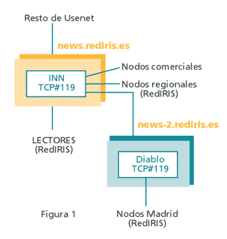 - En cuarto y último lugar, y una vez se haya conseguido que todas las instituciones sin servidores propios de NetNews se hayan movido a news-3.rediris.es, hay que sustituir el software inn de news.rediris.es por Diablo. Para entonces se tendrá una solución al problema de la redundancia en el nodo principal de NetNews, lo que provocará al menos una parada en el normal tránsito news hacia los centros regionales.