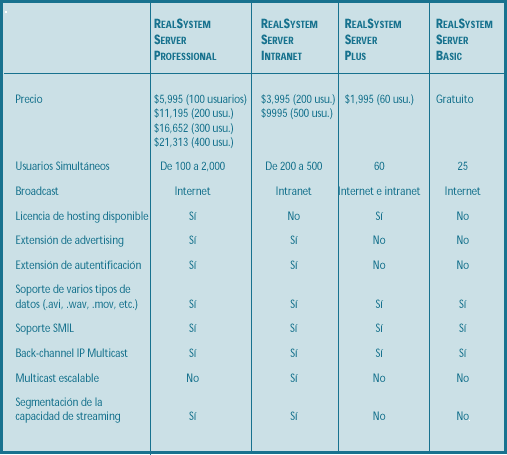 - RealProducer: Es el compresor. Para audio/video analógico existe una versión básica, gratuitapor un año, y una versión Plus de pago ($150). La versión Plus ofrece características exclusivascomo son: un editor para manipular ficheros de streaming, un simulador de ancho de banda,archivar y publicar en web contenidos RealMedia... Existe también una versión de pago queadmite los nuevos formatos de video digital DV ($250).