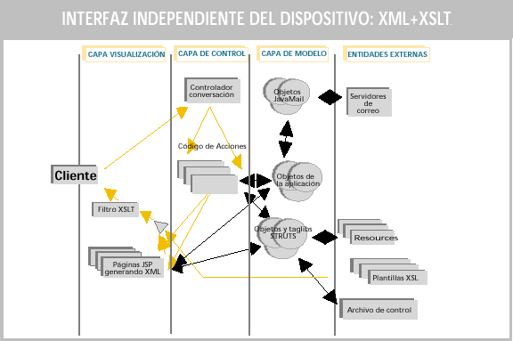 Cuando un dispositivo accede a la aplicación, se analizan las cabeceras de petición para estimar el tipo de dispositivo y el lenguaje de contenidos apropiado para la respuesta. Se realiza la acción de procesamiento correspondiente a la acción demandada por el usuario, por ejemplo listar el correo del buzón de entrada, generando la información correspondiente en el mencionado lenguaje. Por último, se realiza una transformación de la respuesta mediante la plantilla XSL del dispositivo de acceso utilizando el lenguaje XSLT [3].