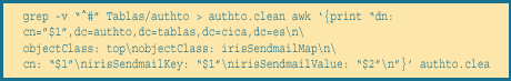 El siguiente paso es traducir la información que está contenida en los ficheros de mapas locales a ficheros LDIF que podamos incluir en el servidor LDAP. Aquí hemos preferido desarrollar herramientas locales que nos hagan dicho paso, y que, básicamente constituyen procedimientos de comandos con "grep" y "awk" que, en una versión sencilla podrían tener este aspecto: