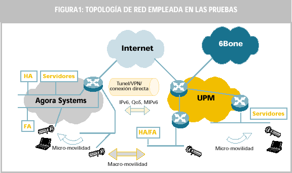 - Configuración de las redes internas y macro-movilidad. La primera fase consistirá en la interconexión IPv6 entre Ágora y la UPM. Se están estudiando diferentes mecanismos, desde la interconexión directa por RDSI de banda ancha o ATM, pasando por túneles convencionales por Internet. No se descarta que se apliquen simultáneamente varias de las alternativas. La primera fase incluye proporcionar servicio de roaming y movilidad entre las sedes mediante MobileIPv6 y la evaluación de las distintas implementaciones. Se utilizarán aplicaciones convencionales sin soporte de QoS y/o movilidad para comprobar el prototipo.