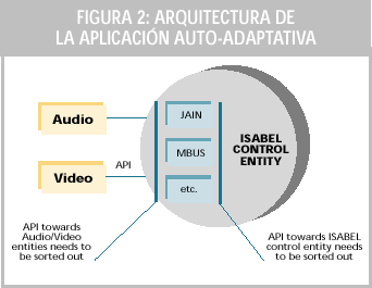 El objetivo principal en la parte de aplicaciones y servicios de nuestro testbed es demostrar como la funcionalidad propuesta por BRENTA mejora la calidad apreciada por los usuarios cuando se producen cambios en la conexión del terminal (por ejemplo un handoff entre WLAN y UMTS) debido a la adaptación automática que realizan las aplicaciones. Las pruebas se van a centrar en flujos en tiempo real y requiriendo bastante ancho de banda. En concreto, se van a implementar mecanismos de adaptación automática en la aplicación ISABEL. La idea básica consiste en que la aplicación reciba información sobre los cambios en las condiciones de la red y automáticamente, en función del ancho de banda disponible, realice los cambios oportunos tales como cambios de codificaciones, cambio en los tamaños de los vídeos, cambios en las frecuencias de muestreo, pasar alguno o todos los vídeos a B/N o incluso usar sólo audio. Por lo tanto, se están definiendo e implementando diferentes interfaces tanto hacia los protocolos de micromovilidad como hacia los agentes de QoS para que se garantice una buena calidad extremo a extremo. Un esquema de esta arquitectura se muestra en la figura 2.